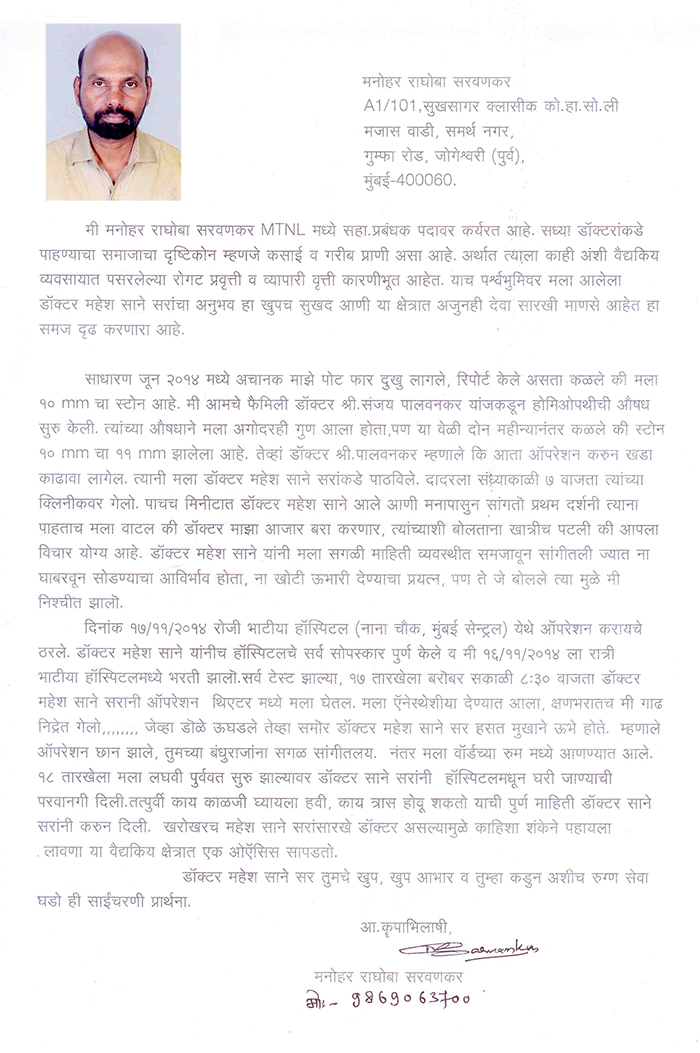 Hi I am Sanjay Aroskar It was the day I was on my work shooting for TV Channel till late night and suddenly got call from my home and my wife sheetal was in pain saying in upper right abdomen there is paining a lot. What I know is little bit of science so I suggested her that it may be because of stones or a kidney problem so take a mild pain killer and will see our family doctor the next day. As I went to my family doctor Dr. Arjun Talawadekar he also diagnosis and said the same thing that my wife may have multiple calculus. So I gently asked my family doctor what can be done for this problem and he suggested me doctor sane's name and the other people with the patient in the clinic also said he is best doctor and not only him his full family is Urosurgeon & Andrologist from his fathers time. In my prabhadevi (dadar) area every people know doctor's family for sure. The very next day I have taken appointment and in the evening me and my wife went to his clinic and what a personality in first look he had given a big smile to us and I guess that smile of doctor's only kill the patient's pain. And then he started asking us what was the status of pain and all. I have seen doctor's Sane's confidence in his conversation and I felt that me and my wife sheetal at the best place and in safe hands. As Dr. sane also diagnosis, he said my wife sheetal have to do some test and around four to five days she needs to get operated urgently. So he himself gave reference of Bombay Hospital and he himself done the operation theater booking also and he said see you guys in Bombay Hospital soon. The hospitals rooms were very well maintained. We both had very comfortable sleep and even the food was very delicious. Overall the Bombay Hospital is very clean and good hearted staff of people around.